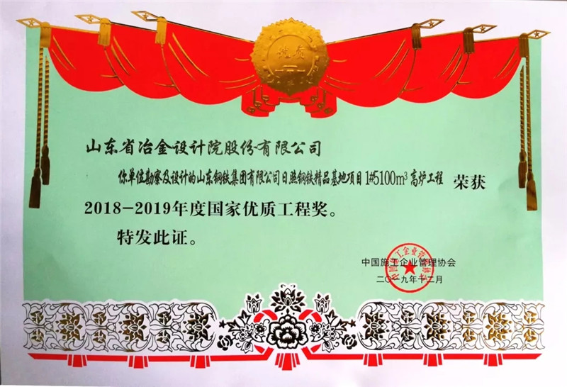 12月8日,2018-2019年度國(guó)家優(yōu)質(zhì)工程獎(jiǎng)總結(jié)表彰大會(huì)在國(guó)家會(huì)議中心舉行,由山冶設(shè)計(jì)總體規(guī)劃、自主設(shè)計(jì)并采取“EPC”總承包模式建成的山鋼集團(tuán)日照精品基地1#5100m3高爐工程喜獲國(guó)家優(yōu)質(zhì)工程獎(jiǎng)。